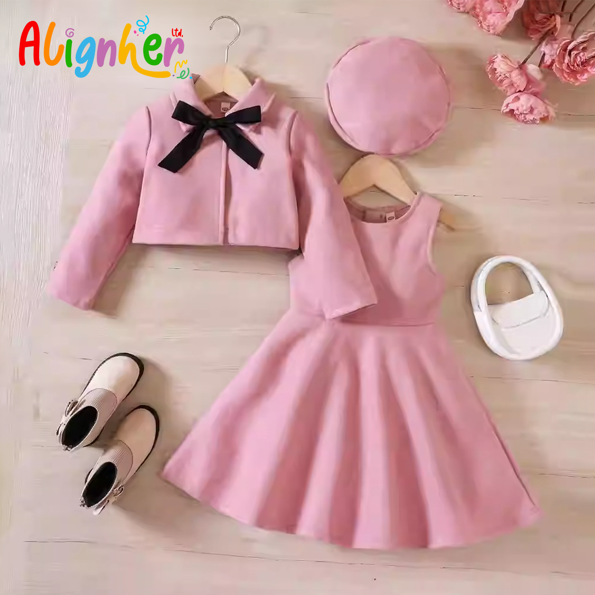 Girls 3-Piece Winter Outfit Set – Sleeveless Dress, Long Sleeve Coat, and Matching Beret Hat
