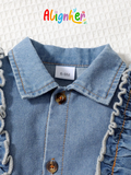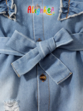 Girls Denim Dress with Bow Belt and Ruffle Detail – Casual Button Down Jean Dress