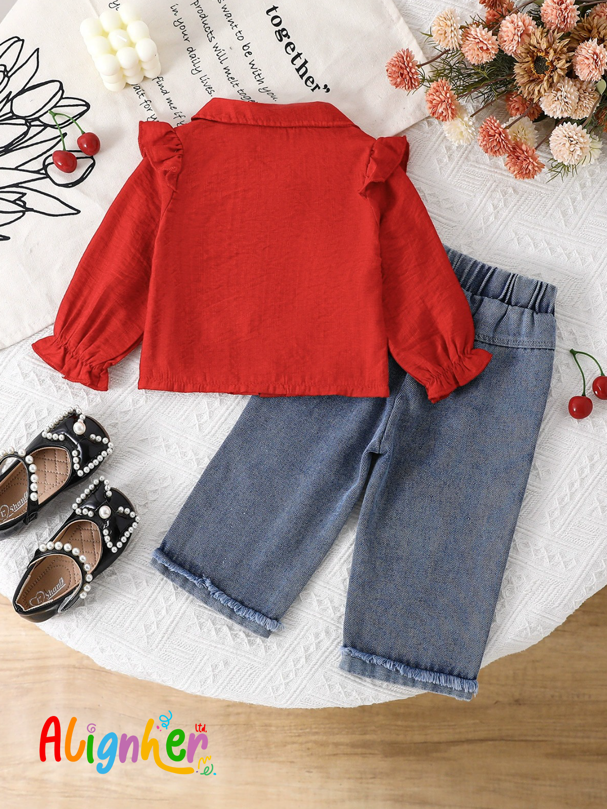 Toddler Girls Outfit Set – Long Sleeve Ruffle Blouse with Denim Pants, Casual Fall and Spring Clothing